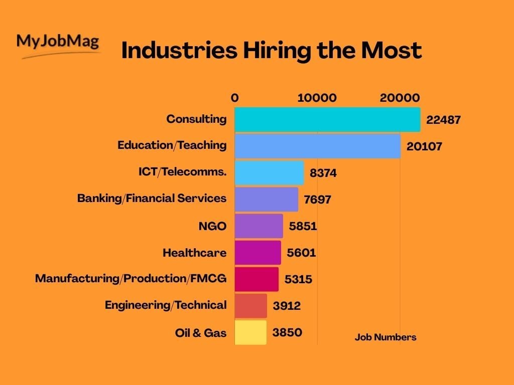 Nigeria’s hiring activity in 2025 was mostly concentrated in Consulting, Education, and ICT/Telecommunication. These 3 industries accounted for a significant share of all job postings. Job seekers targeting these industries have the greatest chance of finding work.