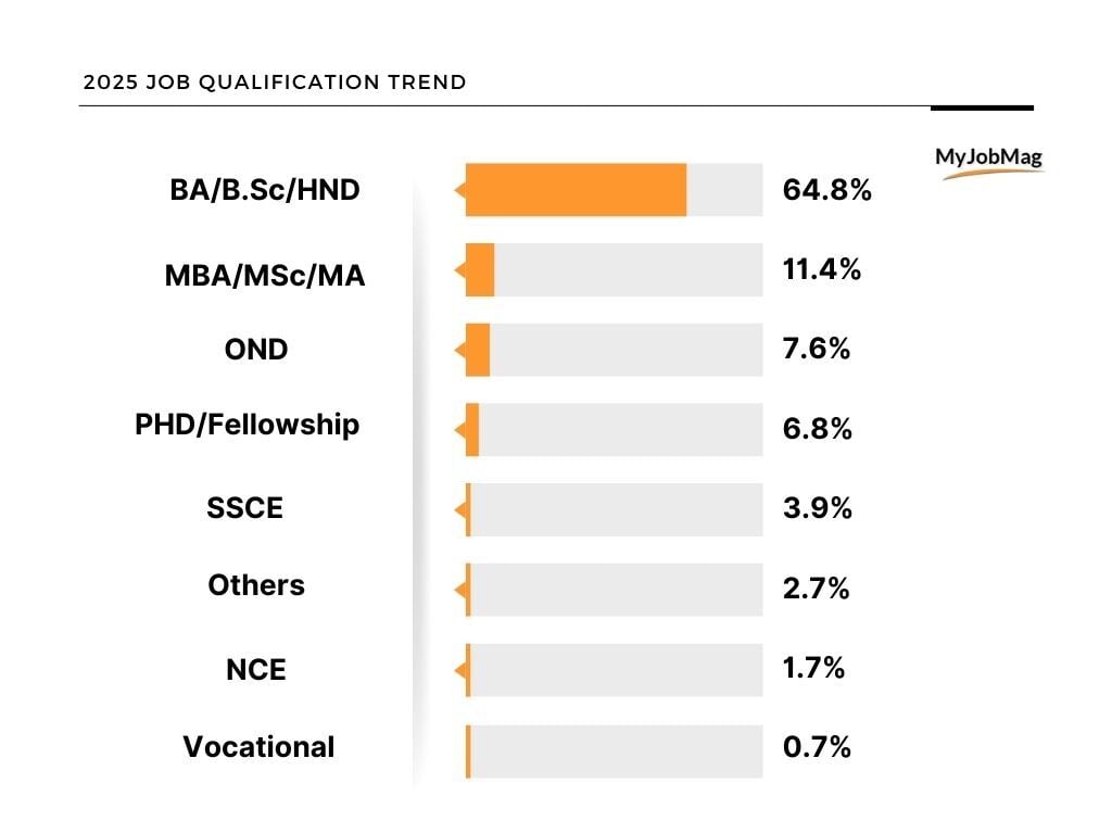 Nigeria’s job market continues to favour candidates with formal higher education. Most job openings required a Bachelor’s degree or its equivalent, making this the most in-demand qualification by a wide margin. A large majority of job openings, about 65%, required a BA, BSc, or HND, showing that employers still see this level of education as the baseline for many professional roles. Postgraduate qualifications were also in demand, with jobs requiring a Master’s degree, making up roughly 11% of openings.