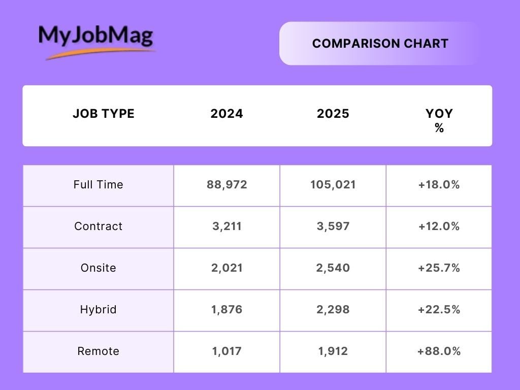 Remote work represents a small portion of total opportunities in 2025. Out of all jobs published, about 2% were fully remote, reflecting a near doubling compared to 2024. Full-time roles, however, dominated the Nigerian job market, making up around 96% of all openings in 2025. Contract and onsite positions together accounted for roughly 5%.