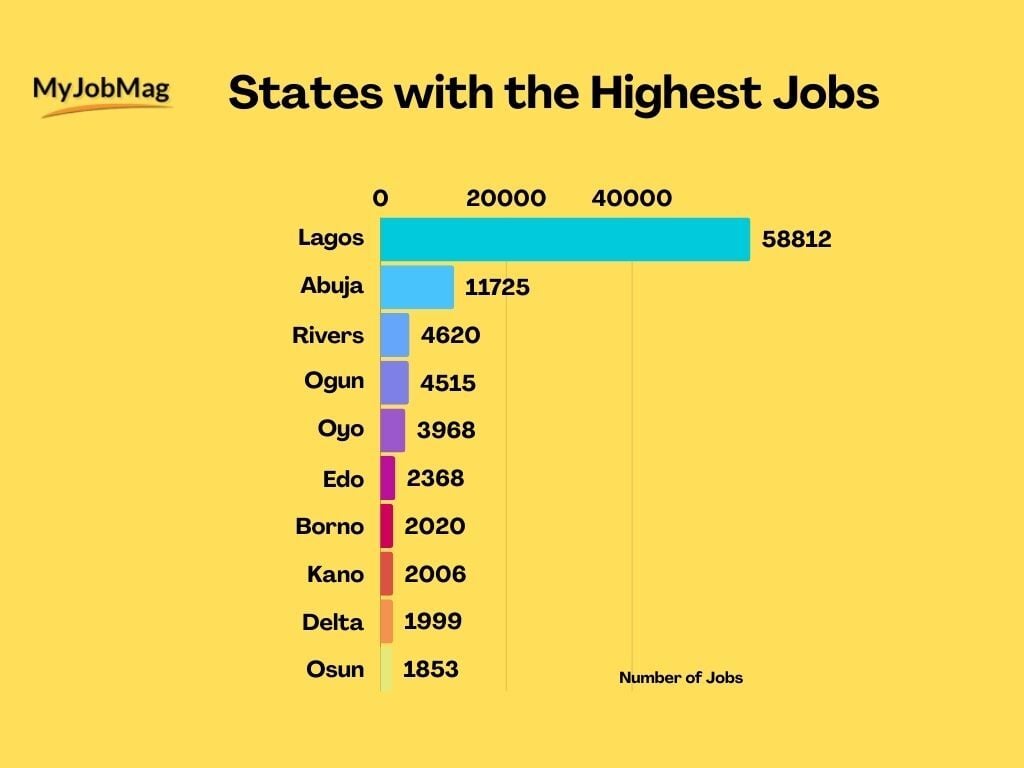 Lagos continues to dominate Nigeria’s job market, hosting more than 50% of all job openings. While Abuja accounts for about 11%, Rivers and Ogun states each contributed roughly 4%. Most northern and less urbanised states collectively accounted for less than 1% each, showing that job opportunities remain highly concentrated in major cities.